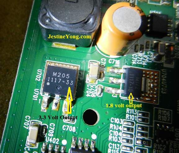 Once the metal cover of the mainboard was removed the first thing I do was to check for the SMD voltage regulator ICs. I saw two ICs ie; 1117-3.3 (output 3.3 volt) and 1117-1.8 (output 1.8 volt).