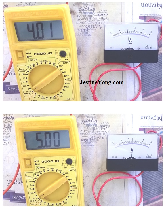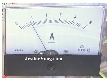 When I ran the first test on it, I had a flowing current of 5A and indeed its indication was approximately 2,7A. Unfortunately, I was so much absorbed from its symptom trying to understand why this was happening, that I forgot to take a comparative photo of this first test (with another measuring instrument connected in series with it).