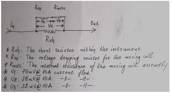 So the instrument’s coil was connected in series with the voltage dropping resistor and then this set was in parallel connected to the shunt resistor.