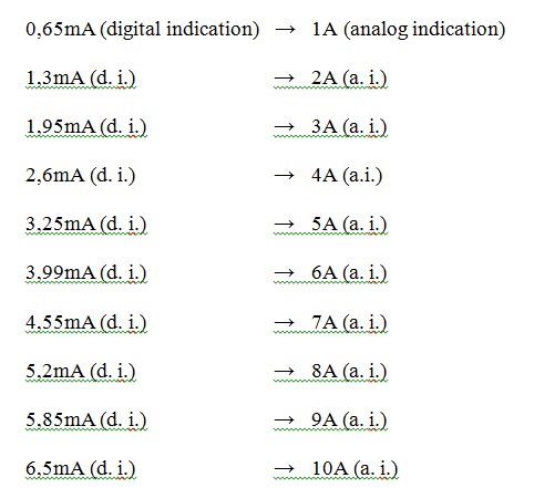 To make things easy for the linearity test, I chose to add before each next step of the procedure an amount of 0,65A to the value of the previous step, which represented 1A indication on its display.