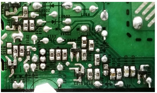 Then I reconnected the PSU and tried to start the unit again. No result. After reheating it, the test led me to a MOSFET nearby. I happened to have a readily available spare of the same type and thus I replaced it. Then I retried again. The same effect…No starting without the heating aid…