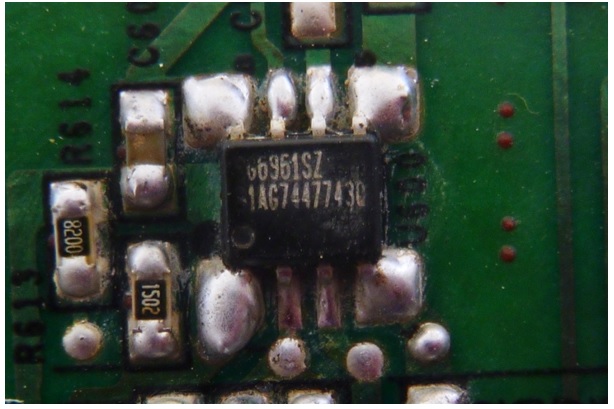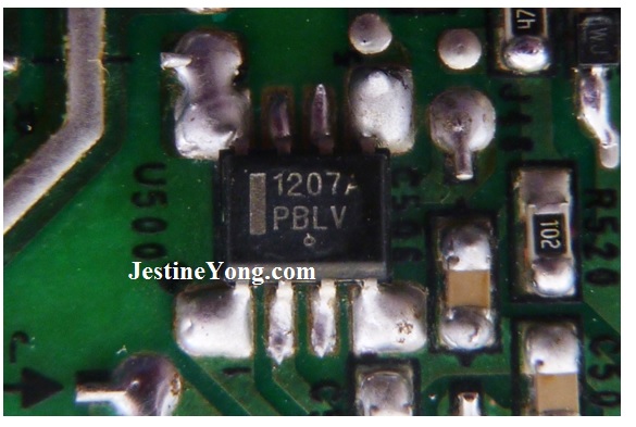 It’s the one just above the black squared painting shown in the second sequentially photo above, depicting the overall SMD side view of the PSU. Its driver I.C which performs the active P.F.C function is a SG 6961SZ as shown just above.