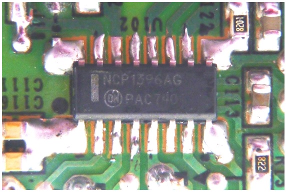 And the last IC for the switched auxiliary voltages of 24V d.c and 16V d.c for the supply of the display inverters etc (NCP 1396 AG), although it was getting the switched 15V, had no other reaction obviously due to the action of some protection signal, of course when I was testing the PSU before removing it. This I.C is shown below: