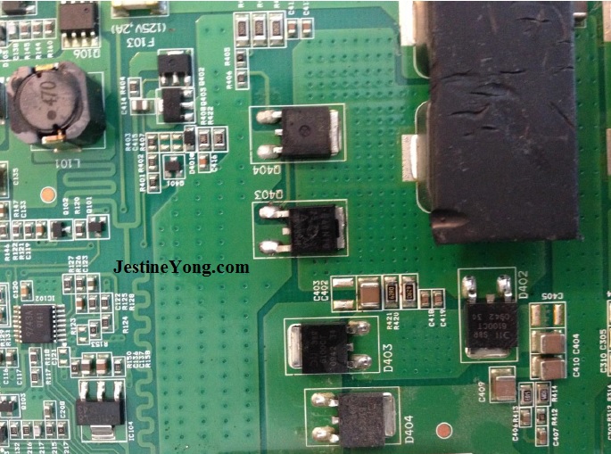 They all measured okay except one Mosfet Q403 that had a low resistance between Source and Drain of about 34 Ohm. And as we know a Mosfet normally always has 2 conditions in which it can be set. Active (ON – About 0 Ohm between Source and Drain) or OFF (Open switch between Source and Drain, meaning a high resistance of about 1500 Ohm or more).