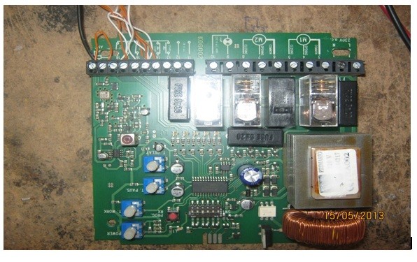 There were two relays on that board on to give signal to one side of the door and other relay for the other side of the door. I have to give it an order to make sure that both the relays are in working conditions. I made a wire jumper and connected one side to open and the other side to open and the relay clicked and I could read 220 volts on one side of the motor terminals. I did the same thing with the other side and it worked fine as well.