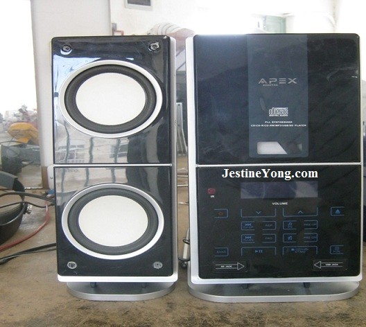My thoughts shifted to the main program of this CD player. This CD player has two speaker output, one head phone output and on Aux jack. I inserted an active speaker system in the head phone jack and I could hear nice sound. I sent a message to APEX Company and asked them about this problem. They responded back very quickly telling me that the only answer to this problem was the remote control. Someone has changed the setting on the output of this CD player. I called the customer to get me the remote control and he told me he bought it used CD player and no remote with it.