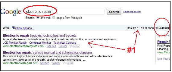 Recently i noticed that there were lots of visitors signing up to become ERG member. I do not know why until when typed in some keywords in Google. For the keyword “electronic repair” my website www.ElectronicRepairGuide.com ranked number 1 out of 19.5 million website! For “electronic repairing” keyword, my website also ranked number 1 out of 4.5 million website! I have tested some other keywords and my website ranked in the first page. Because of this, i get lots of new visitors to my website and it was very encouraging! I’m not sure whether the searches from your country will show the same result or not but i guess it should be the same regardless of which country you key in the keyword in Google. If you get different result please do let me know.