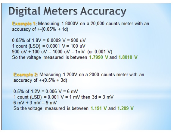 Now what is this “+1” or “+2d”, “+3d” etc… that you find in every analogue meter accuracy specifications? It means that we have to add the value of 1 or 2 or more “digits” to the accuracy of the reading. Confusing? Yes indeed it is! The word “digits” is very unfortunate in this case, it would be much better to use the word “LSD counts”. What you have to add to the percentage of the reading value is a number of counts of the Least Significant Digit for this range. Here below are two examples:
