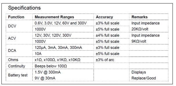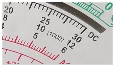 Resolution is not often mentioned in Analogue multi-meters specifications. At least I couldn’t find any specification amongst the various models I surveyed. It is probably because we can find the resolution by looking at the scale divisions…