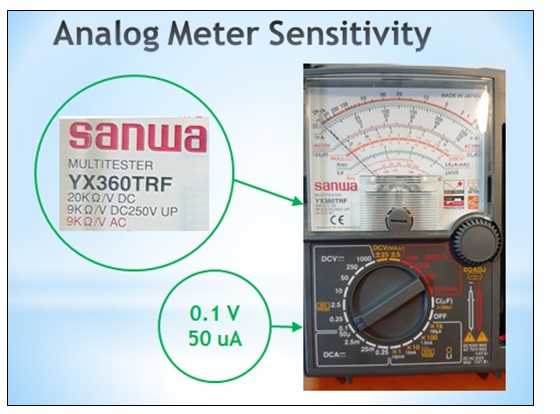 Sensitivity however is one of the most important characteristic of analogue multi-meters. This is because the meter must draw a certain amount of current from the circuit it is measuring in order for the pointer to deflect. The less current, the more sensitive the instrument is. The meter appears as another resistor placed between the points being measured. This characteristic is specified in terms of a certain number of Ohms per Volt (or Kilo-Ohms per Volt). The Ohm/Volt figure allows us to calculate the effective resistance for any given range. Just by multiplying this value by the range.