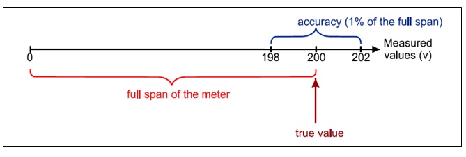 Thus accuracy is not ambiguous. It just tells you how far you are from the goal! The figure below shows the accuracy of a measurement in relation to the full scale of the meter.