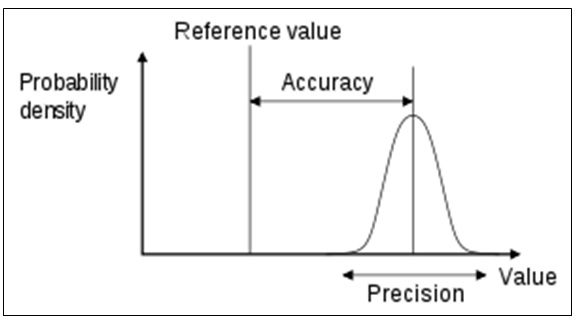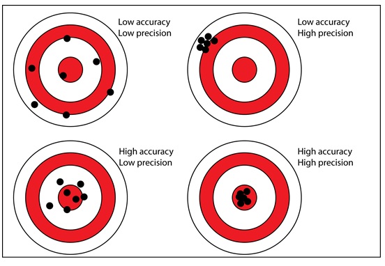 A measurement system can be accurate but not precise, precise but not accurate, neither, or both. The figure below better illustrates those differences: