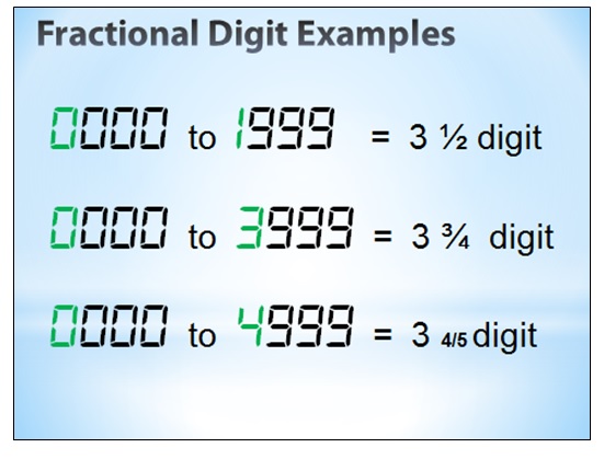 Digital meters are specified by the maximum number of digits they can display. It often consists of a number of full digits (each of them can display any number from 0 to 9) plus one fractional digit (1/2, 3/4, 4/5 etc…). This fractional digit is what often leads to confusion. It is a digit that can only display a few numbers (0 to 1 or 0 to 3 etc…). Usually the rule is as follows: