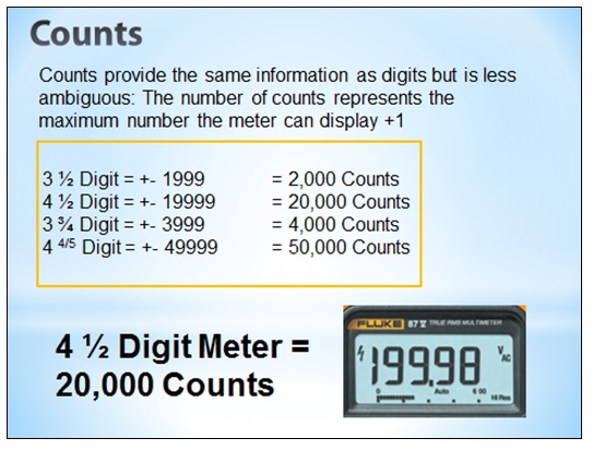 To avoid the possible confusion due to wrong interpretation of the fractional digit, manufacturers also provide the number of counts for a given instrument. This is exactly the same information as the number of digits but much easier to understand: