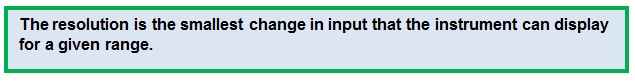 The resolution is the smallest change in input that the instrument can display for a particular range. Resolution is also often confused with accuracy but has nothing to do with it. Resolution is defined differently for analogue and digital meters, so we will discuss this separately for both types of instruments.