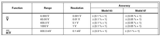 To start with, let’s have a look at the accuracy table of a Fluke Model 87 (4 ½ digits):