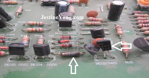 A 220 ohm resistor, a 2n5401 and 2n5551 transistors were found blown and shorted on the same line of the other transistors were found before. As you can see in the photo, the part numbers are printed on the board. All these blown and shorted parts were replaced with the same part numbers and when I powered up the device, everything worked nicely.