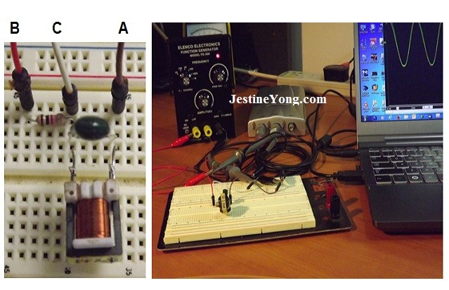 I wanted the job done; therefore I decided to find an alternative way. The idea was to use the resonance of a LC circuit, connecting a capacitor in parallel with the inductor to be measured. If I could find out the resonant frequency I would be able to calculate the inductance. Here is the test circuit: