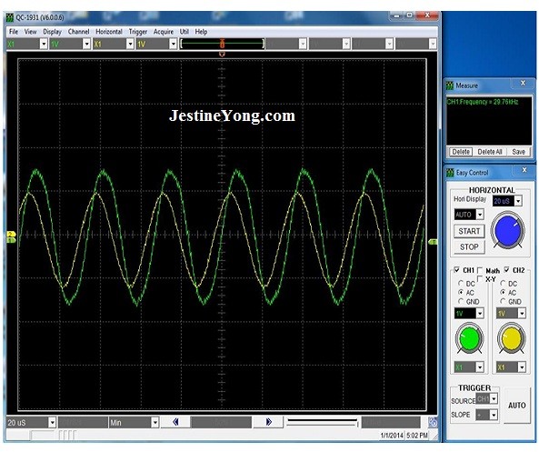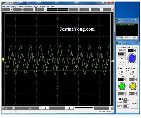 I used a 1 kΩ Resistor, a 0.01 µF capacitor, a simple function generator and my trusted USB oscilloscope. The function generator is connected between A and B and set for sine wave. The channel 1 of the oscilloscope (Green) is connected between A and B to measure V1, and the channel 2 of the oscilloscope (Yellow) between A and C to measure V2. Here are the settings:
