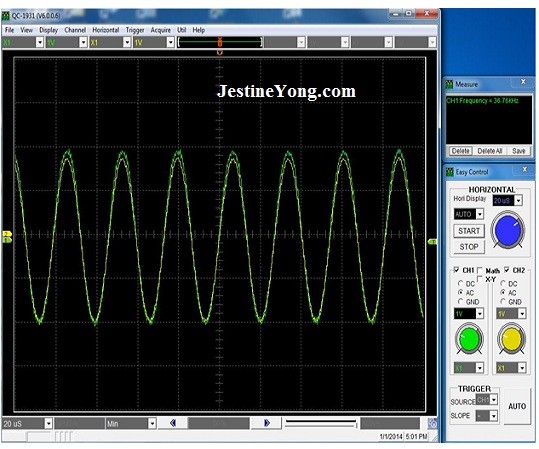 The resonant frequency, for this particular LC parallel circuit, is 36.76 KHz, as indicated by the oscilloscope.
