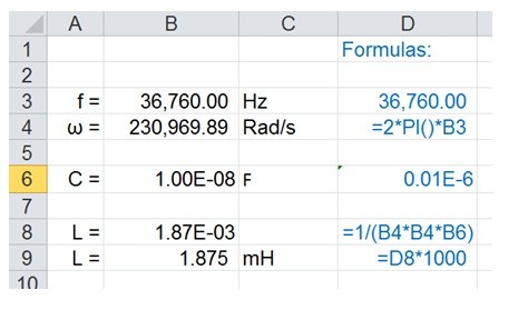 I tried this method with various small inductors, from 100 µH until 100 mH, it worked fine. To make it easier I entered the formulas in a spreadsheet, so I just type the frequency into the corresponding cell (B3) for each measurement to get the result immediately. Here is a screen dump of the spreadsheet, where I included the formulas for each cell: