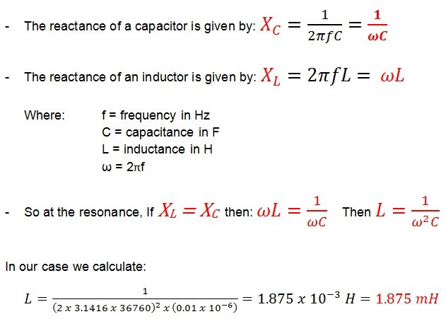 – The resonance is achieved when the Inductor’s reactance (XL) is equal to the Capacitor’s reactance (XC). Hence, for this particular LC circuit, at 36.76 kHz: