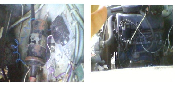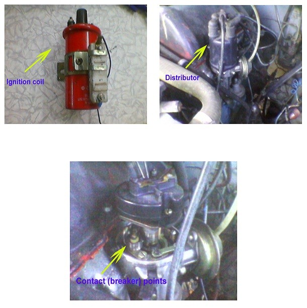 The engine of hisautomobile works with gasoline as combustible and uses Ignition coil, distributor, contact (breaker) points and spark plugs, as we can see below: