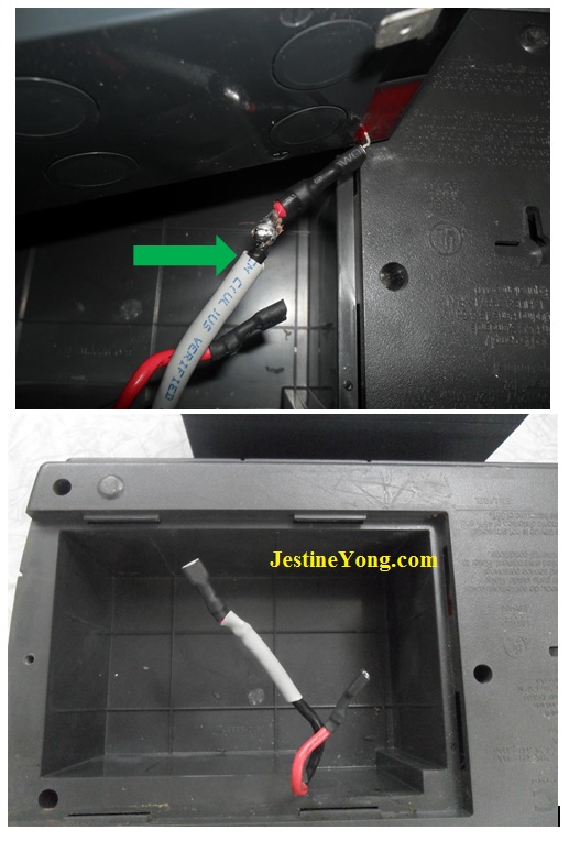 A terminal in good conditions was taken from another out of use UPS. The new terminal was welded into the negative cable which attaches the battery, and isolated later with a piece of shrink tube.