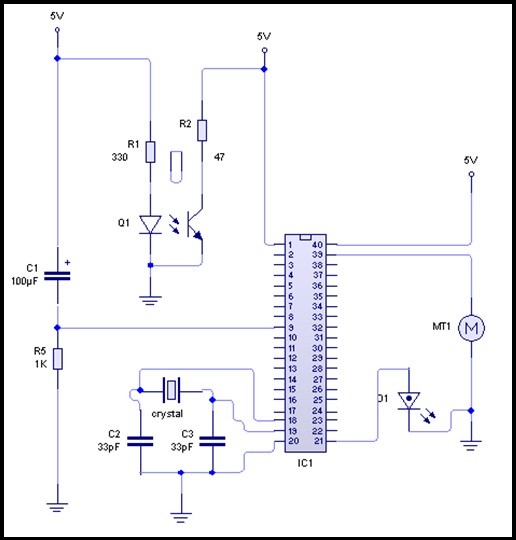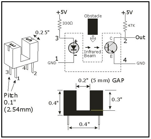 The photodiode received about 3.3V – 5v dc supply and emits an infrared signal. The light emitted by the IR LED could be blocked, from reaching the phototransistor base for the following reasons: