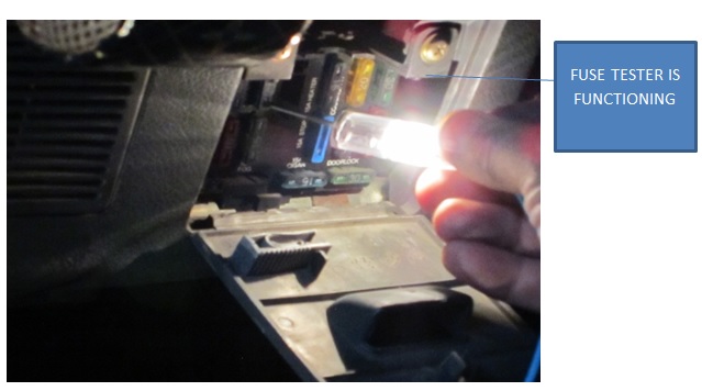 • Touch the probe  of the tester to each fuse if the  lamp turns on this means the fuse is ok if not fuse is blown (each fuse has two side; negative side and positive. If the fuse is not blown, the lamp must light up for two sides otherwise the fuse is blown)