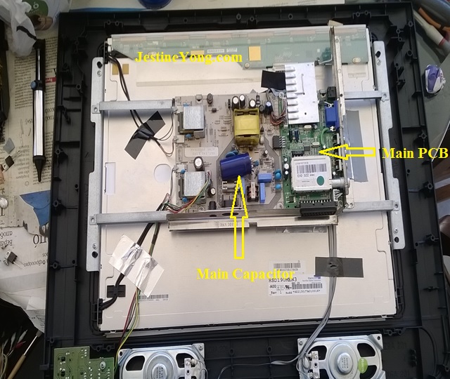 Well, after one more day the set started to shut down repeatedly and irregularly. The problem was already there. I opened the set removing its back cover. This below is its internal view.