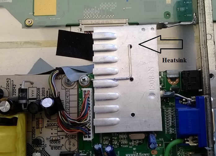 You can see the heatsink in the photo below. The processor is underneath, at the right side of the cable connector shown, almost at the middle of the PCB. I attached it using  three tinned copper wire retainers soldered directly on the chassis around it.