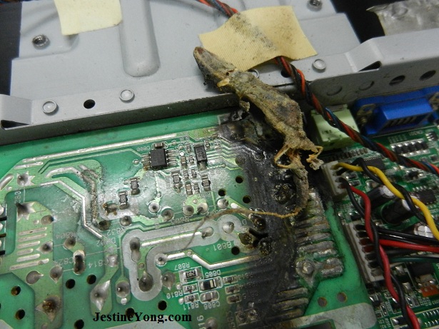 A customer sent to me a LCD Monitor with the complaint of no power. The moment the metal cover is removed guess what I saw? Two burnt dead lizard yike!