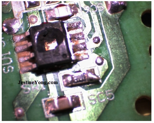 From the controller chip top only the characters LD could be determined. Everything else was blown away. But the 2 earlier mentioned little plastic top parts still weren’t lost and readable. The part name of this chip on the pcb was SU1.