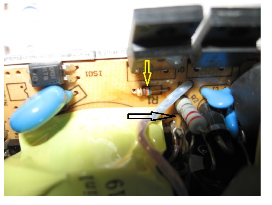 Above the now 2 unCapped and internally totally shorted Mosfet and special MURF860 Diode. On the left from them is the mounted optocoupler. Plus 2 resistors in front of them on the component side with an original value of 620 ohm (R1) and also a bigger 0.22 Ohm (R2) were defect (burn marks see next photo). And their values were also wrong now!