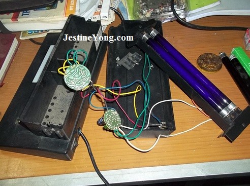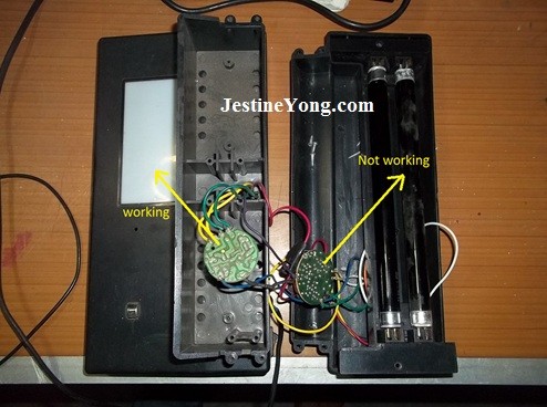 As I opened the machine I found two circuits. Two CFL bulbs with 6 watt each.