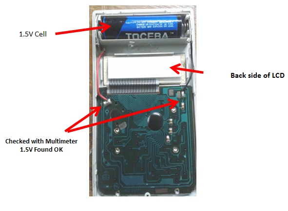 Yesterday when I am doing some calculations with my calculator I found the display on screen was very dim. I thought the battery cell of calculator was the problem. Hence I have opened the calculator to replace the cell. Suddenly I recalled that I have replaced it with a new cell about a month ago. I guess the cell could have been defective causing the dim problem. When I checked with my Multimeter I found that both the cells (showing 1.5 volt) were good. This means the problem could be in somewhere else.