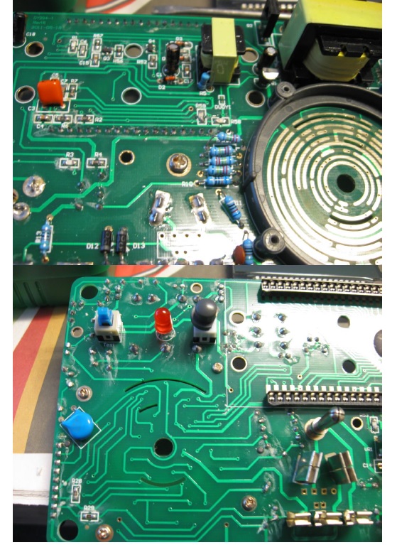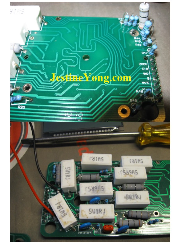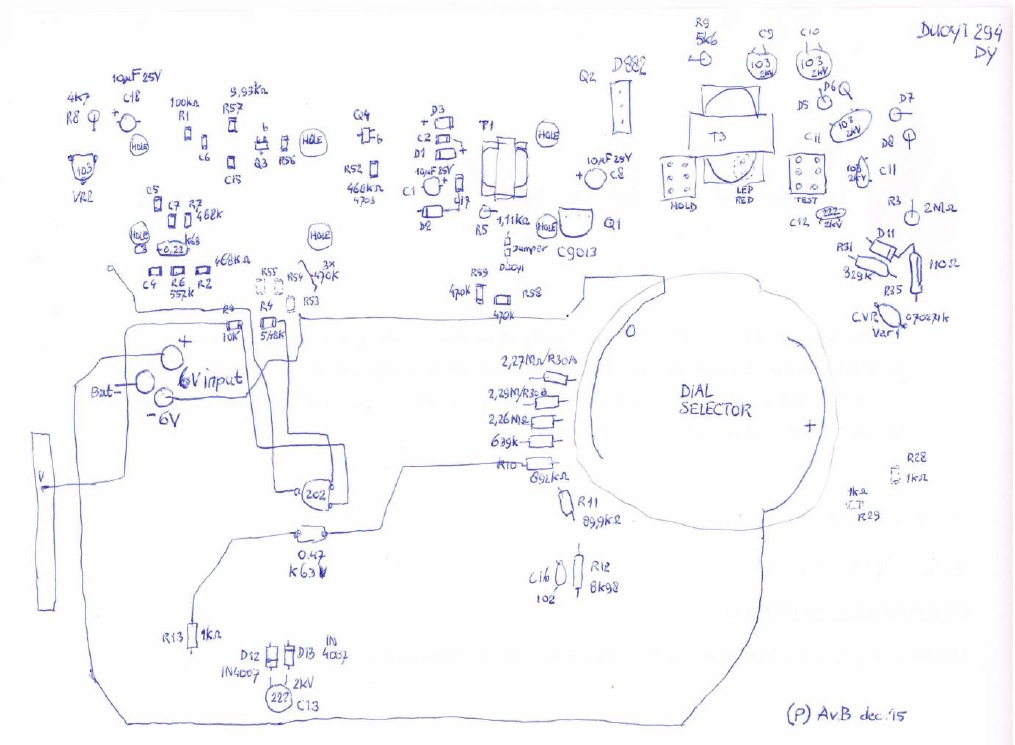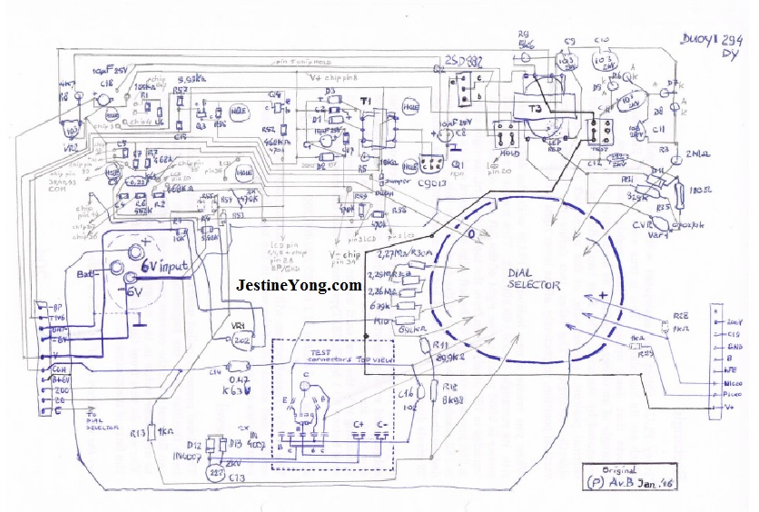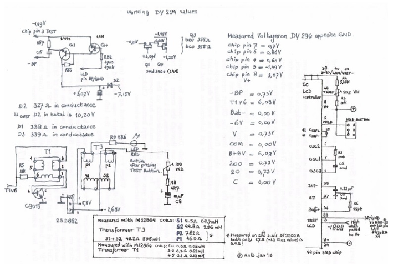 Next picture shows all components used in our DY294 tester (all R values are measured in circuit with a Digital Meter and give a good idea what the right value is):