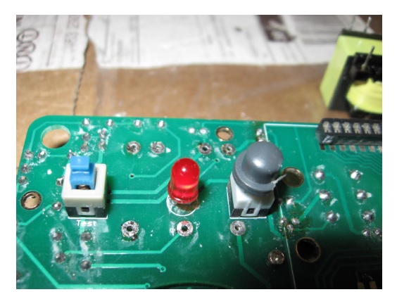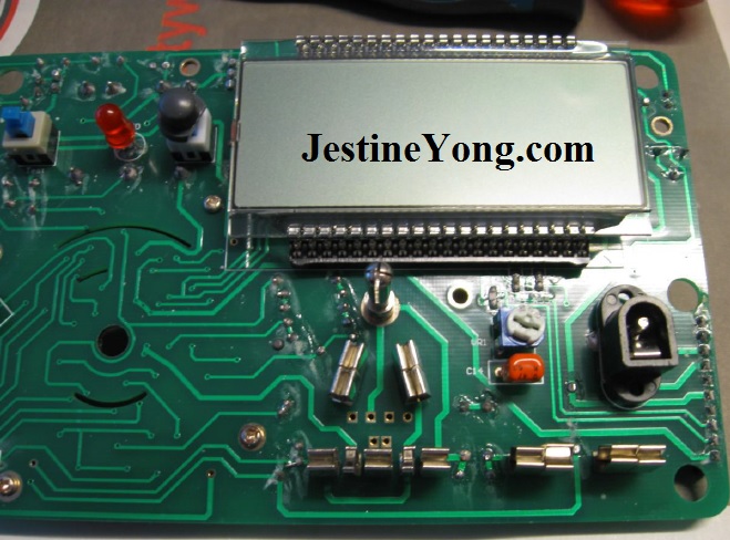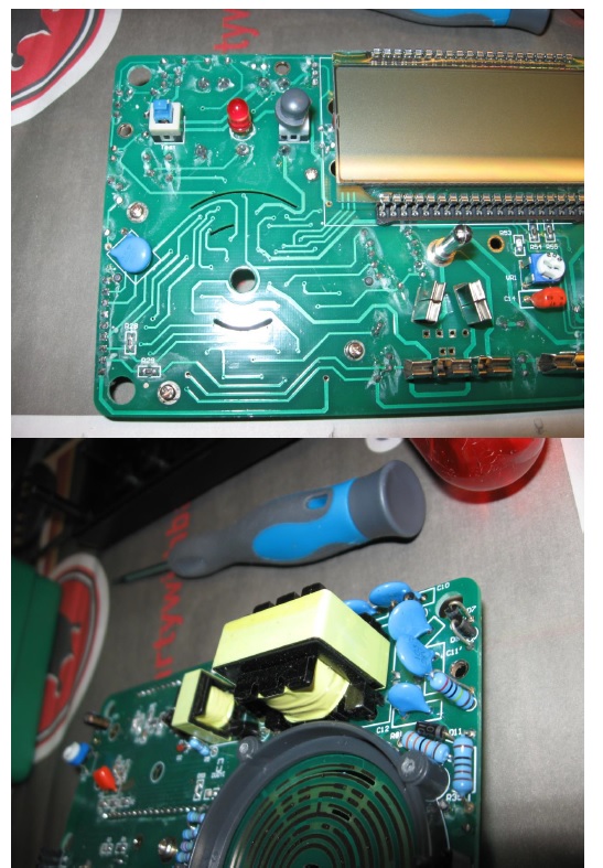 It also shows that there are only 2 adjustable variable resistors in the DY294, being: VR1 which adjusts the Vref+ level into our LCD controller chip, and VR2 that adjusts the High Voltage level coming from transformer T3. (Which becomes active including the Red Led when we press the TEST Button).