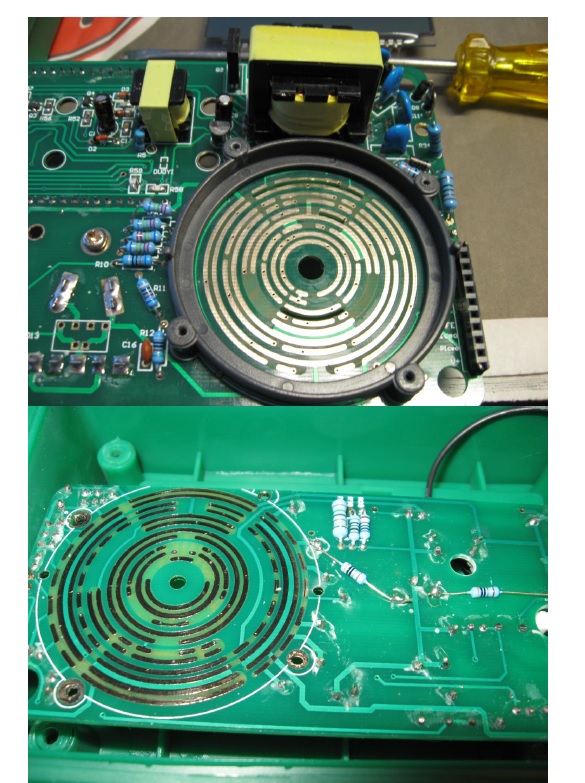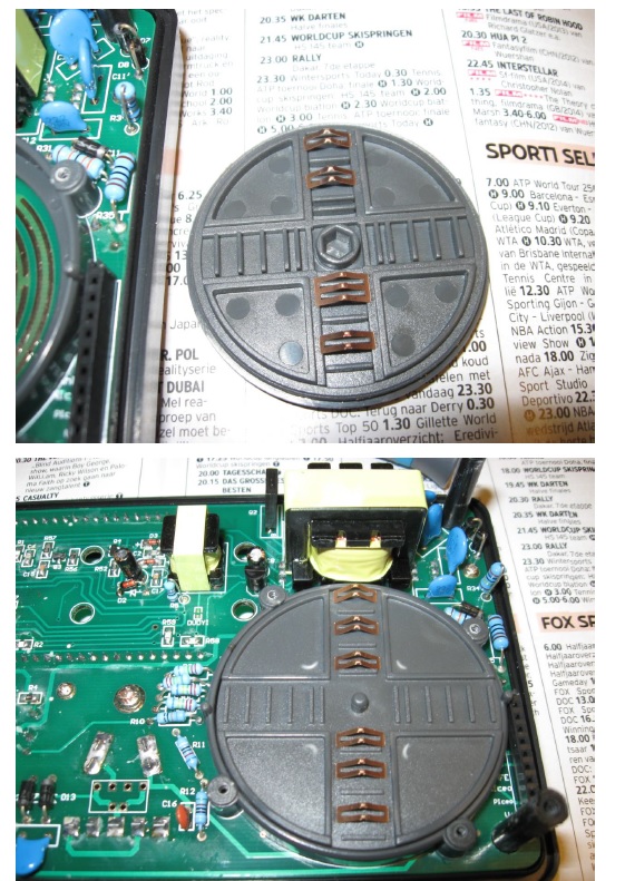 Next Photo shows the other side with the contacts that stay visible when the dialer contact wheel is put back in place. So the second and also last photo of the Dialer contact wheel shows exactly how the Dialer wheel/knob is assembled correctly before closing the Housing/case of this DY294. And in this position you have to make sure you put the front Knob pointing to the top OFF position!!