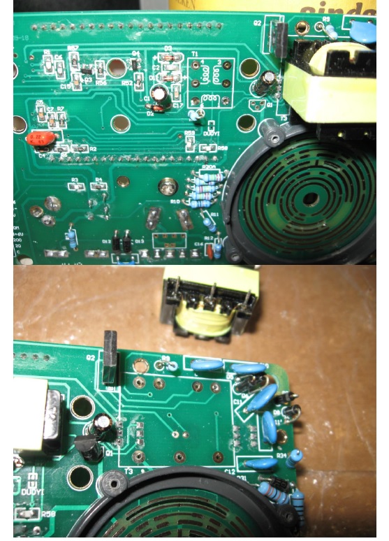 And my M12864 Graphic ESR/LCR/TransistorTester gave following values measured on the Bigger Transformer T3. The Primary coil connected to R9 measured 46 ohm without any mH or uH value. Same with second Primary coil that is connected to VR2 that measured only 78.2 ohm and also no mH/uH value. And the remaining 3 pins on the T3 Secondary High Voltage consists of 2 coils . The Secondary coil between the Middle pin and the outer pin directly connected to C9 labelled 103 2KV gave a value 44.8 ohm and 256mH. And the last Secondary coil from the Middle pin to the outer pin that is directly connected with one side of C12 222 2KV gave a value of 4.5 ohm and 68.7mH. The total Secundary Coil value measured on both the Outer pins gave 49 ohm at 588mH.
