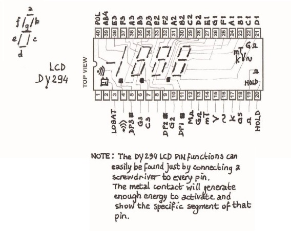 I had no clue what controller was used because it had no markings. But I knew that I could examine the display functions in the LCD by touching any of the 40 pins of the display by using a metal screwdriver. The contact potential voltage would enable the connected segment of that pin. And with this information it should probably be very easy to destillate what controller was used inside the DY294.