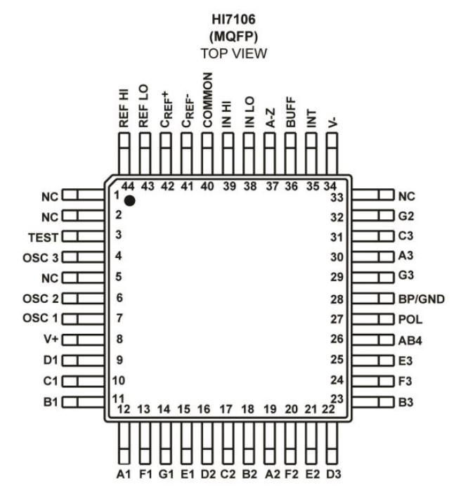 And although a ICL 7106 chip would fit without short circuiting because the previous V+ pin 43 is correctly a REF LO function that needs to be connected with COMMON and IN LO, it also is not the correct needed chip because it misses a HOLD pin 5 ( NC pin on 7106), and doesn’t have a BATLO pin either (PIN 33 LB). And our Tester needs that function too!