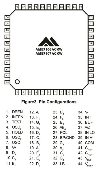 The AME7106 however is the correct chip for our DY294! See following picture from the AME7106 datasheet (Pins 1 and/or 2 are probably not used however. And Pin 3 is only a means to test if all your LCD segments are OKAY) :