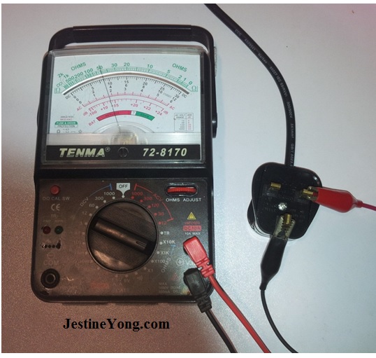 Next step, measuring between Live and Earth, the digital meter was showing inconsistent and unstable readings. It was time to switch to the analog meter. This was one of those situations where the analog meter is much better. An insulation leakage is not a linear load and its value will depends on the current passing through. The analog Ohmmeter supplies more current to the device under test than the digital meter, so we have a better chance to get some reading. The meter displayed a stable value of around 50 kΩ, which indicated an insulation leakage and explained why the circuit breaker tripped off… The insulation resistance must show infinite under any scale of the analog meter. I could also have done an insulation test but the present measurement was enough to highlight the problem.