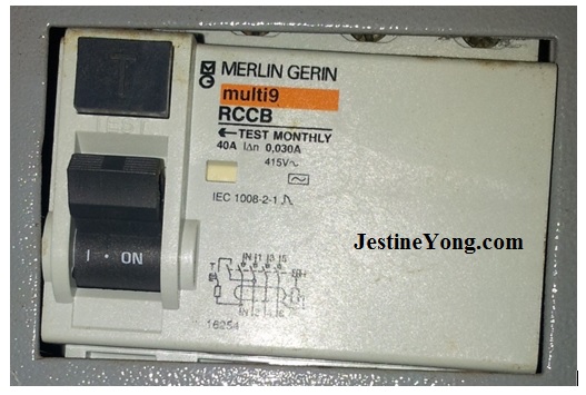 The figure below shows one of the RCCB installed in our house. It is labeled 40A and 0.030A. It means that it will trip off if the current is higher than 40A (3 phases) or if the leakage to Earth is higher than 30mA!