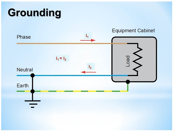 In a house or apartment the Neutral is usually connected to the Earth in the entrance switchboard. From there, three separated lines are fed to the power points. Each piece of equipment will be connected to the Phase (Live) and Neutral. The frame or cabinet will be connected to the Earth as seen below. When there is no fault the current flowing from the Phase line will be the same as the current returning through the Neutral. There is no current flowing through the Earth wire.