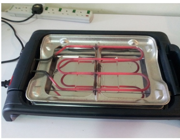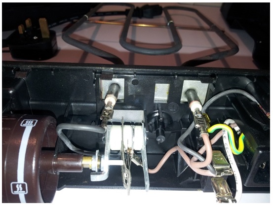 As we can see there is not much in it and it is easy to disconnect the heating element and measure it. As expected the results were the same as measured directly from the power plug. So the heating element is definitely faulty. As the grill is like new but have not been used for more than 3 years I suspected that the problem could have been caused by moisture entering the element. Can it be fixed? I wondered if, by heating the element, we might get rid of the moisture but I wanted to be sure so I did a search on the Internet. Sure enough I found a site where someone restored a coffee machine heating element by heating it on a gas flame. And it worked…