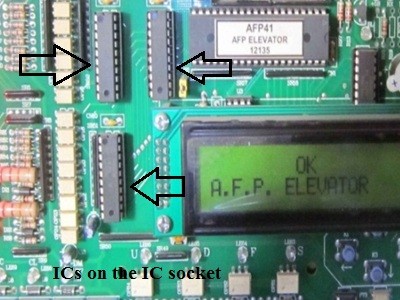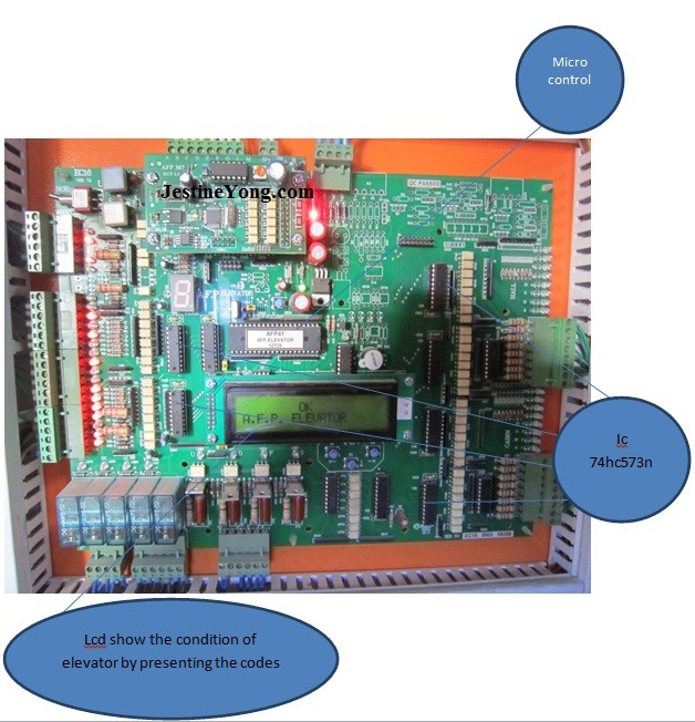 It has 8 level building> and 8 seven segment diode display>each seven segment need one driver IC.  I knew that each seven segment LED diode would be drive by one IC and that IC was the 74HC573N. Google confirmed that these ICs are the driver of seven segments diodes. Fortunately the manufacturer of the board had made this a friendly board because the 8 ICs were installed on IC sockets.