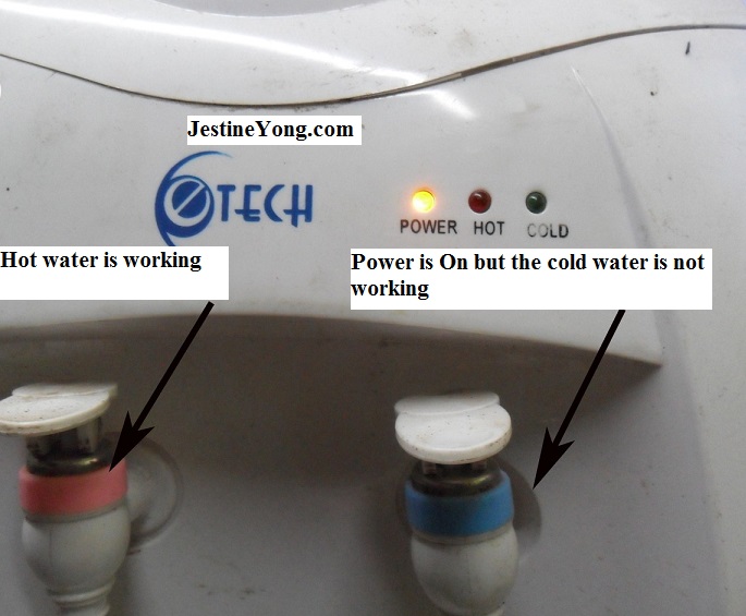 The complaint of this Etech hot and cold water dispenser was it has power and the “hot” side can work but the “cold” side was not giving out cold water. As usual in order to check what is wrong with the dispenser one has to open up the cover and do a visual inspection first.